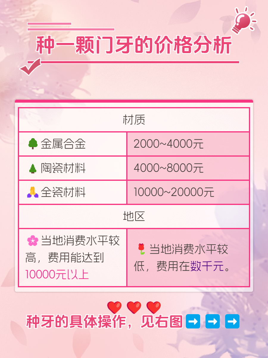 种牙一颗的价格通常在3000元到30000元之间不等,具体价格受到多种因素的影响。不同类型的种植体因其设计、材质、可靠性等方面的差异,价格会有很大差别。高端品牌的种植体,材质优良、设计美观且可靠性强,... 详细»