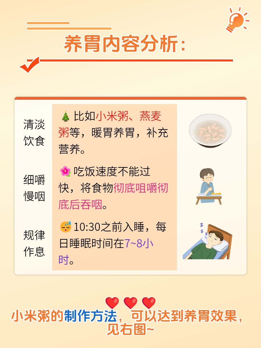 ⭐️3、规律作息:日常生活中也要保持良好的作息,不要熬夜,以免影响到胃的正常工作。每晚应在10:30之前入睡,不宜超过11点或12点。