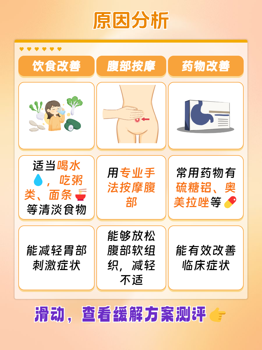 🌈2、腹部按摩:饮食调整的同时也可以配合按摩腹部,以肚脐为中心,按照顺时针或者逆时针的方法轻轻的按摩腹部,能够有效促进胃肠道的蠕动功能加快,缓解胃难受恶心的情况也有一定好处。