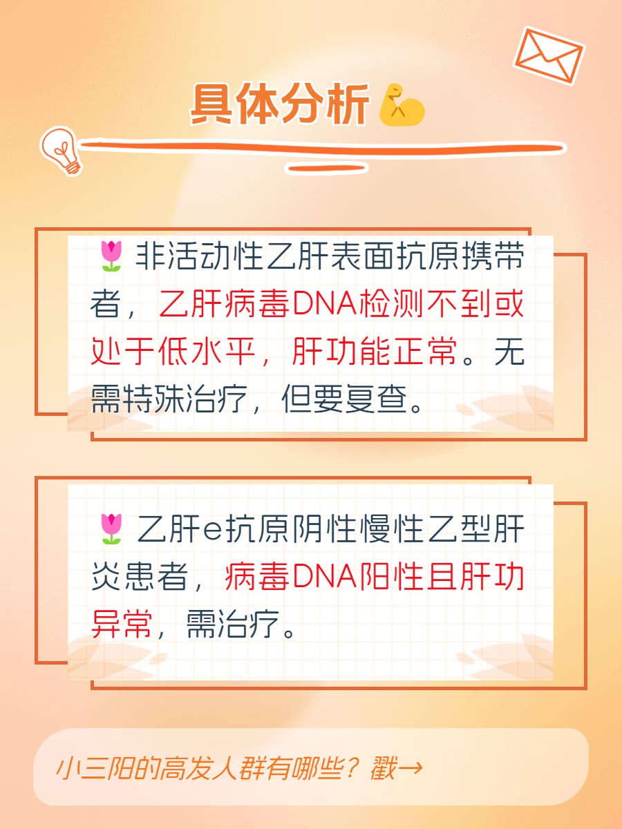 ❤️非活动性乙肝表面抗原携带者:乙肝病毒 DNA 检测不到或处于低水平,肝功能正常。这类患者病情相对稳定,一般不需要特殊治疗,但需要定期复查。👩⚕️乙肝 e 抗原阴性慢性乙型肝炎:乙肝病毒 DNA 阳性,肝功能异常。这类患者需要根据具体情况进行抗病毒、保肝等治疗。💊