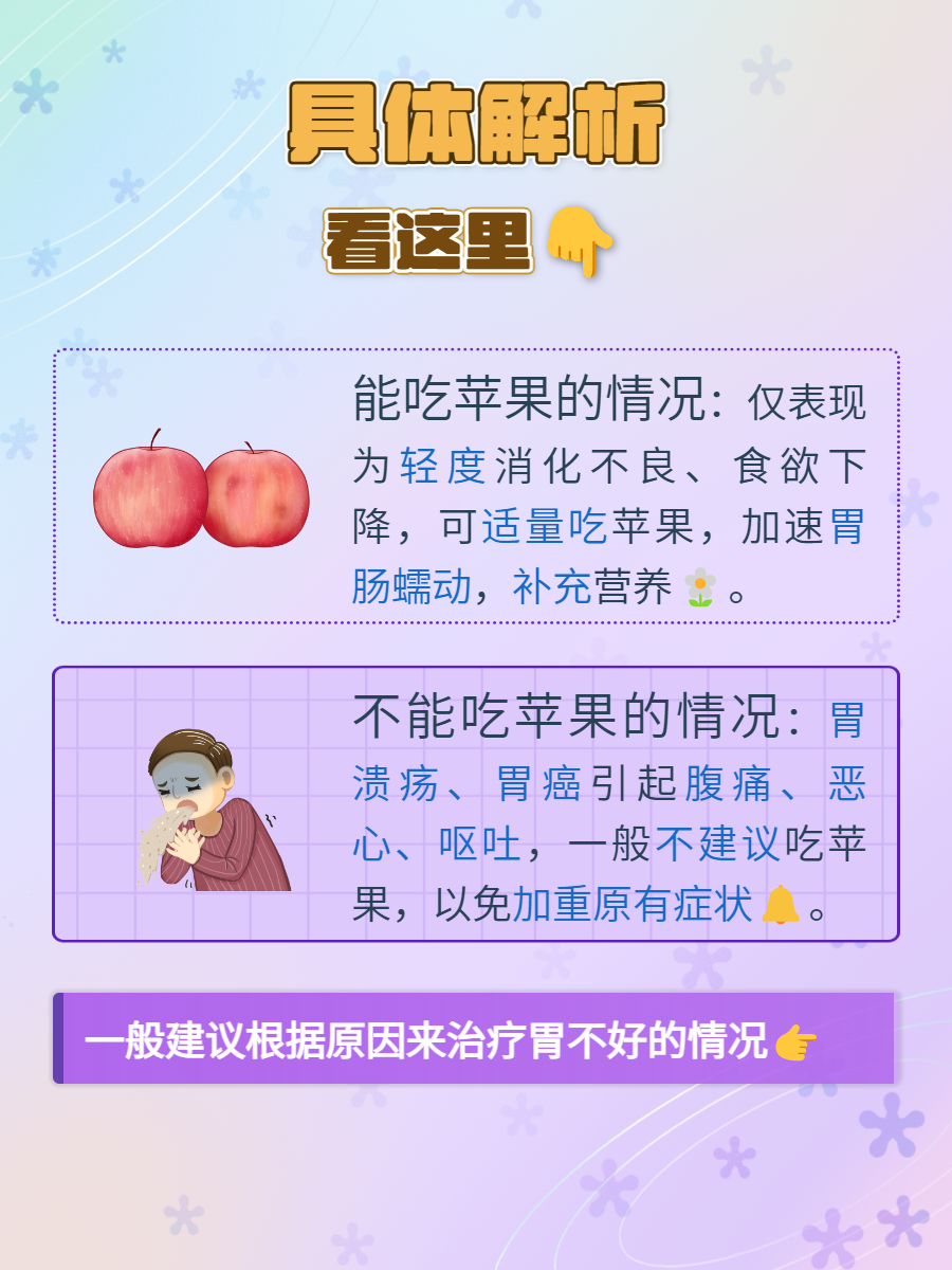 🔊胃不好是一个相对宽泛的概念,如果仅表现为消化不好,出现轻微食欲下降、恶心等现象。这种情况一般是可以适量吃苹果的,一方面是因为苹果富含果胶、纤维素等物质,这些成分有助于促进胃肠蠕动,改善消化功能,帮助食物正常消化吸收,有利于预防上述症状进一步加重。另外一方面是适量吃苹果,可以补充机体所需的维生素、碳水化合物、钾元素等营养物质,有利于提高机体的抗病能力🌼。