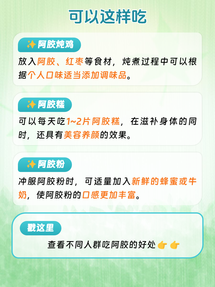 阿胶的滋补效果比较强,希望通过这些方法能够让大家对阿胶的吃法有一些简单的了解。如果感觉这篇文章对你有用,也可以积极点赞、分享❤️,让更多人对阿胶的吃法有了解。