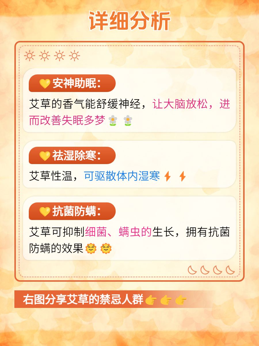 2️⃣祛湿除寒:艾草性温,具有显著的祛湿除寒作用。在夜间睡眠时,艾草枕头通过持续释放温热能量,有助于驱散体内寒气,促进血液循环,对于缓解因寒湿引起的关节疼痛、身体僵硬等问题有较好地效果🌿。