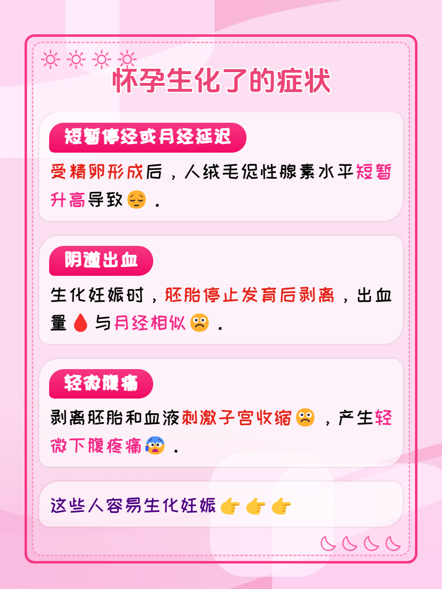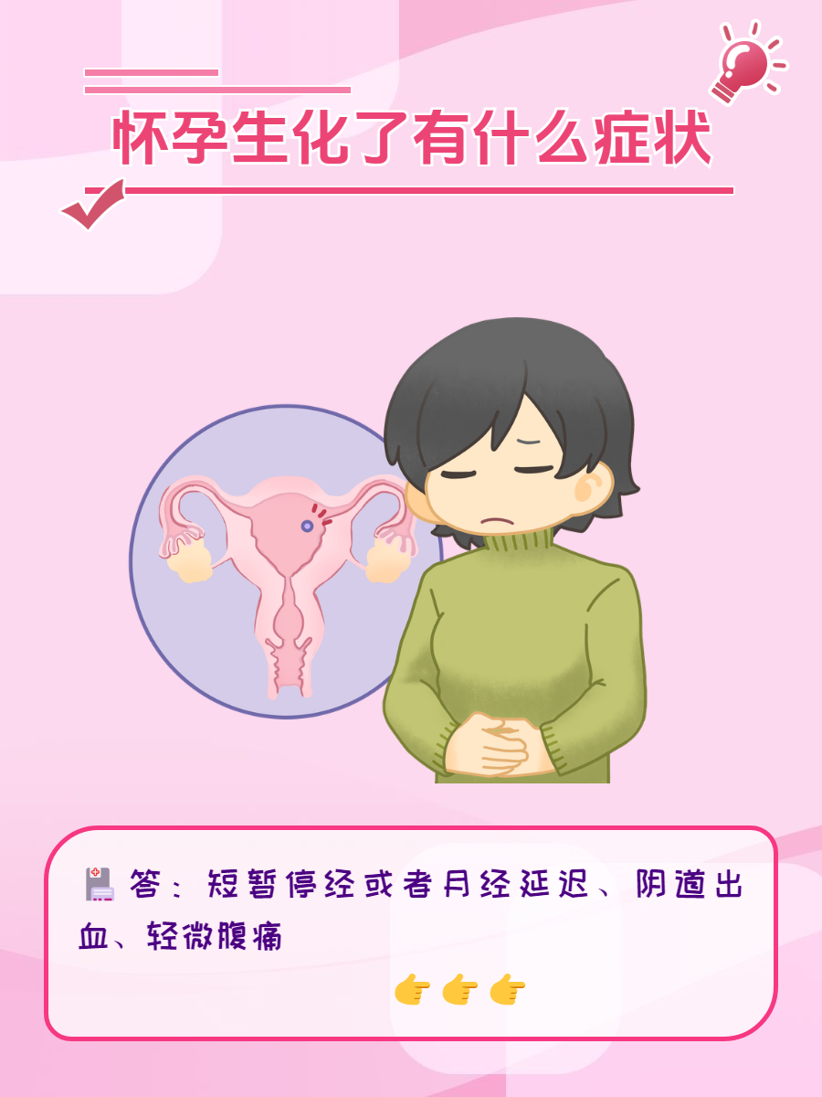 生化就是我们所说的生化妊娠,生化妊娠是指精子和卵子结合发育为受精卵后但没有着床的情况。如果怀孕后生化妊娠了会有哪些症状呢,下面汇总一下分享给大家: