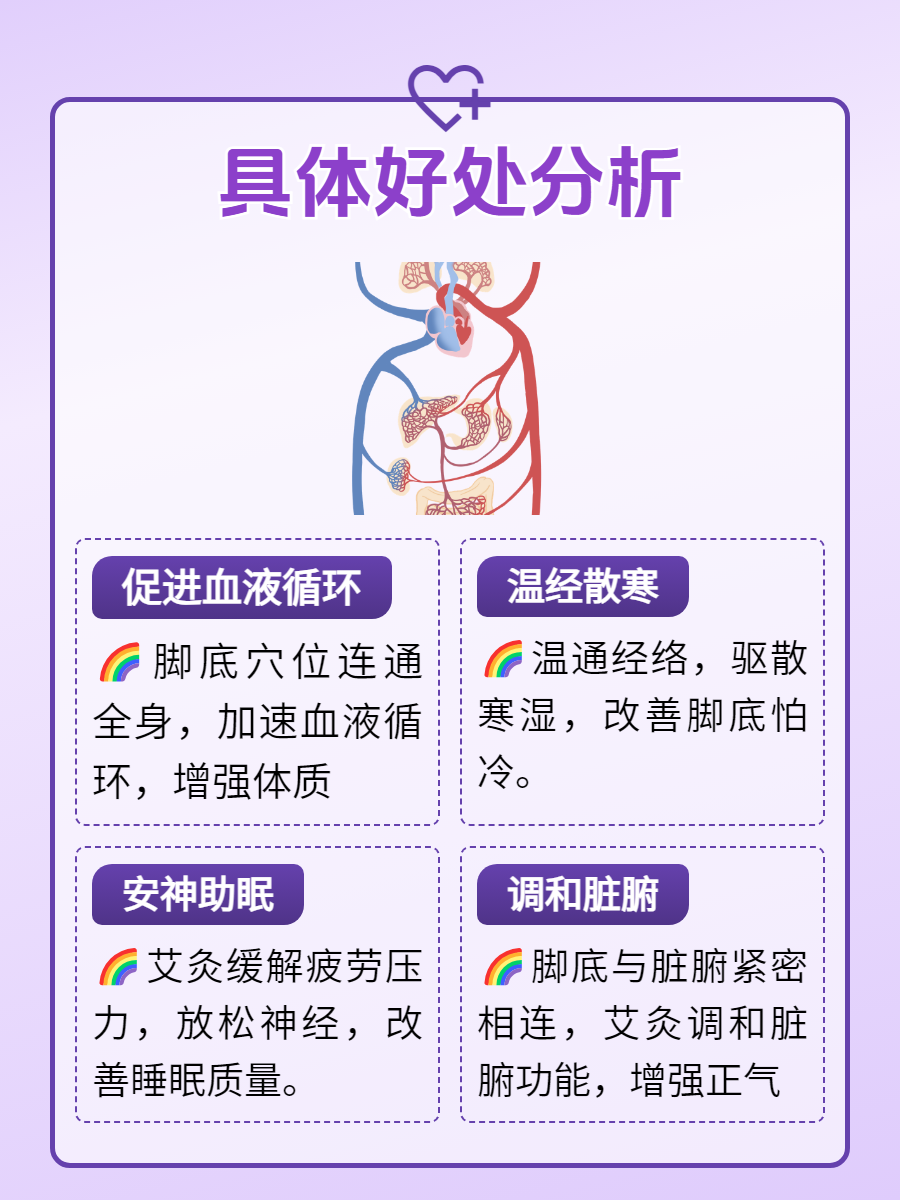 🌟脚底密布着众多穴位,这些穴位与全身各部位相连通。艾灸脚底时,温热刺激能够加速血液循环,不仅改善脚部的血液供应,还能促进全身血液循环,从而增强体质,提升免疫力。对于长期站立、行走或运动的人群而言,这一益处尤为明显,有助于缓解下肢疲劳和酸痛。
