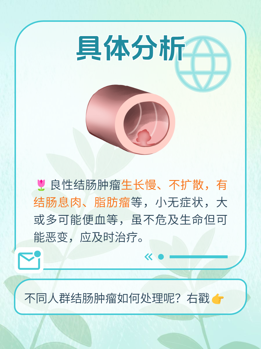 良性结肠肿瘤一般生长比较缓慢,通常不会像恶性肿瘤那样迅速扩散和侵犯周围组织及器官。常见的良性结肠肿瘤有结肠息肉、脂肪瘤等。😃比如说结肠息肉,很多时候是在体检或者因为其他原因做结肠镜检查时被发现的。如果是小的息肉,可能没有明显的症状。但如果息肉较大或者数量较多,可能会出现便血、腹痛、腹泻等症状。而脂肪瘤一般比较少见,通常表现为局部的肿块,质地较软。💩对于良性结肠肿瘤,我们也不能掉以轻心哦。虽然它们一般不会危及生命,但如果不及时处理,也有可能发生恶变。所以一旦发现有良性结肠肿瘤,最好及时进行治疗。