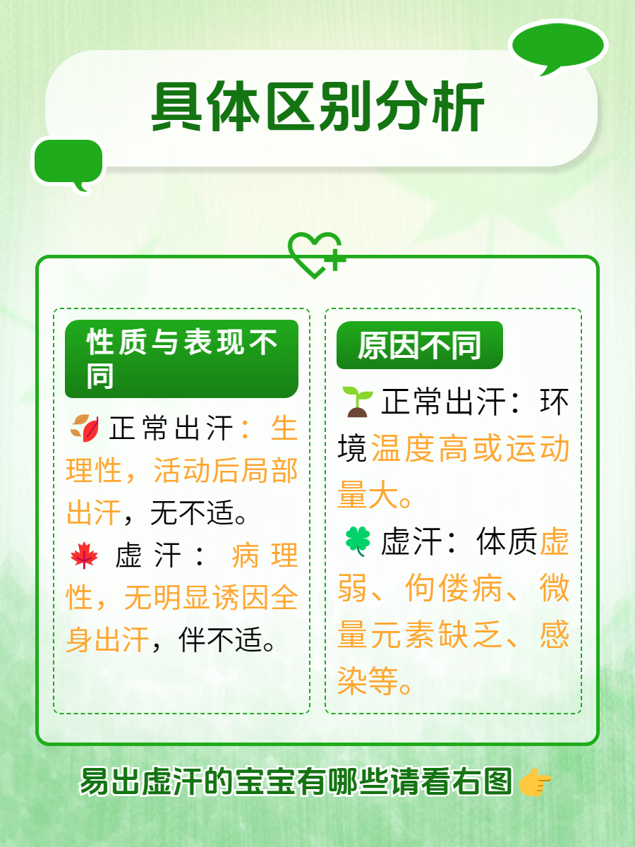 🍃原因不同🍃:正常出汗多由环境温度或运动量引起;虚汗则可能与体质虚弱、疾病状态如佝偻病、微量元素缺乏、感染等有关。