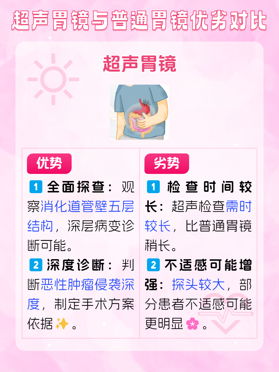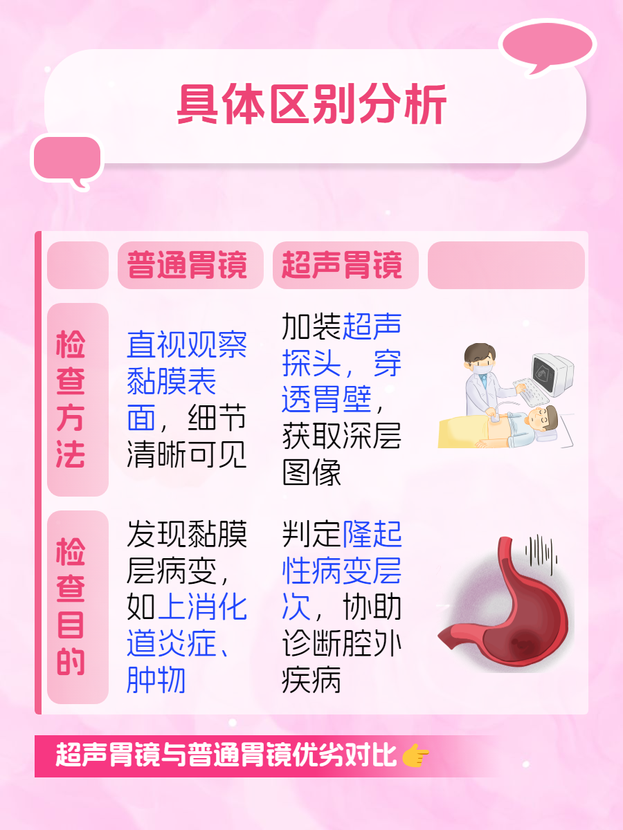 普通胃镜,如同一位勇敢的探险家,手持电子摄像头,穿越口腔,直达消化道深处,直视观察上消化道黏膜表面的细微变化。而超声胃镜,则是在此基础上加装了微型高频超声探头,它不仅能够“看”到黏膜表面,还能利用超声波穿透胃壁,深入黏膜下层甚至邻近脏器,进行实时扫描,获取更丰富的组织学特征及周围脏器图像。这种“透视眼”的能力,让超声胃镜在诊断消化道深层次病变时显得游刃有余。💙