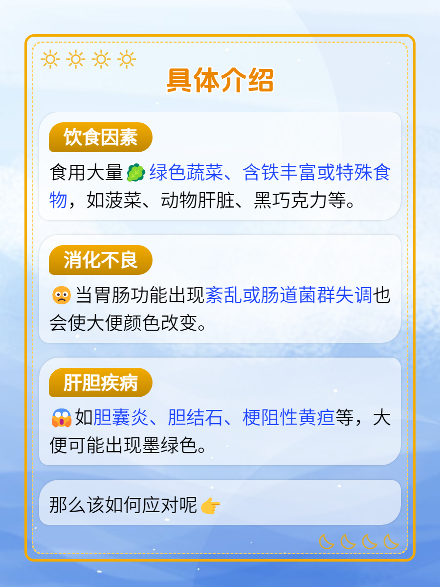 当胃肠功能出现紊乱时,食物在肠道内的消化和吸收过程可能会受到影响,导致大便颜色异常。😕例如,肠道蠕动过快,胆汁在肠道内停留时间过短,来不及充分转化为正常的颜色,就会使大便呈墨绿色。