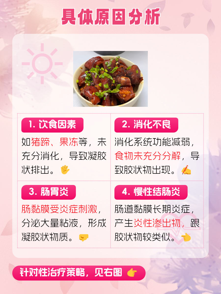🍃当消化系统功能减弱时,食物无法被充分分解和吸收,部分未消化的食物残渣可能混合肠液形成凝胶样物质。这种情况多见于饮食不规律、暴饮暴食的人群。🍃