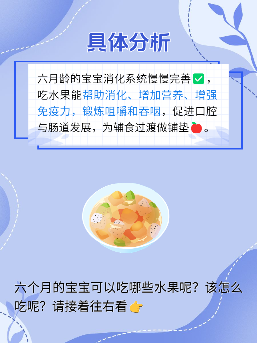 💑对于新手爸妈,什么时候开始给宝宝添加辅食,特别是水果,是一个令人关注的问题。通常,宝宝大约在六个月左右可以开始尝试吃水果,这可不是随便说说,是有一定道理的👇。