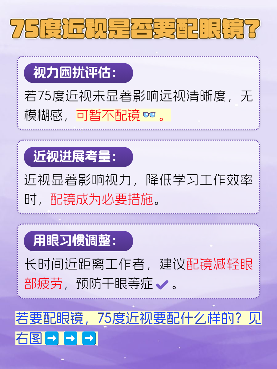 🌸1、视力影响程度:如果75度的近视对日常生活和工作没有造成明显的视力困扰,如看远处物体时仍然清晰,没有模糊感,那么一般不需要配戴眼镜。
