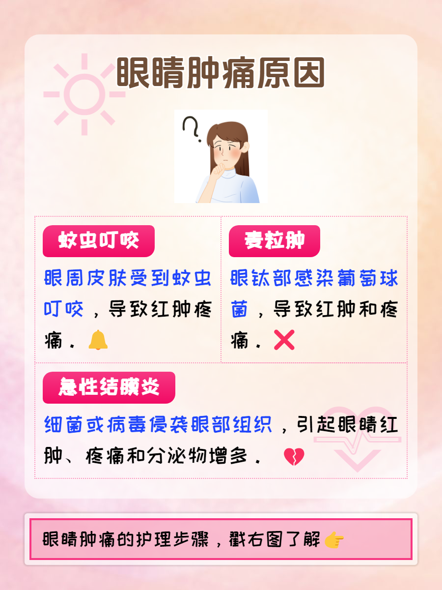 1. 蚊虫叮咬🙁:眼部周围可能受到蚊虫的叮咬,导致局部红肿和疼痛。在眼部周围涂抹抗菌素类眼膏,如红霉素眼膏,通常2~3天可消肿。😊同时,注意保持眼部清洁,避免用手揉眼。