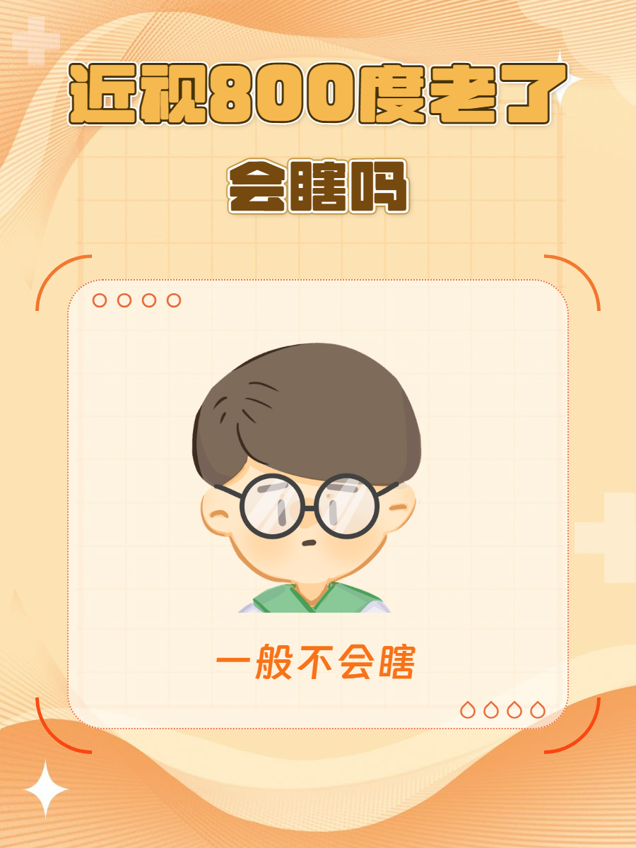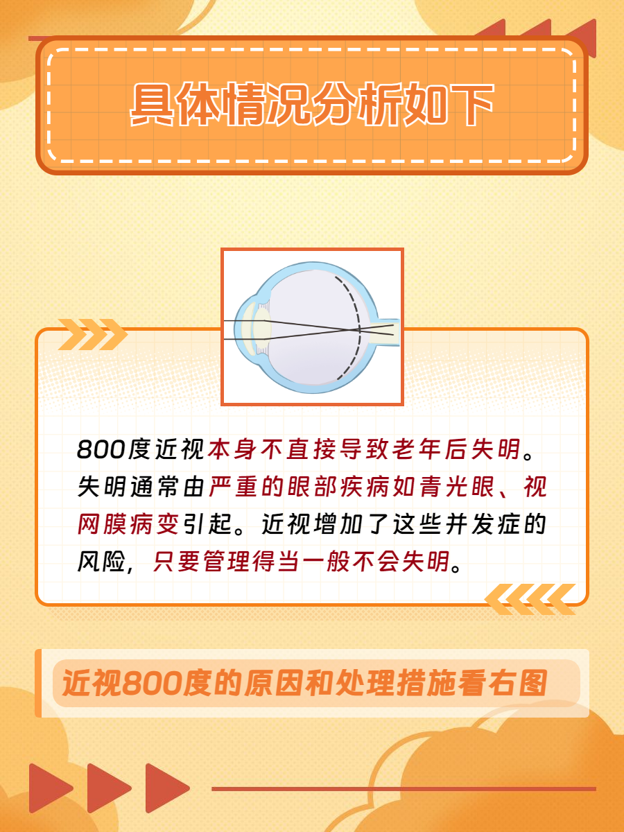 800度属于高度近视,眼球的前后径明显延长,眼部的结构也发生了相应的改变,会对视力造成严重的影响,比如视力下降、视野缺损等,但一般老了是不会瞎的。✔️