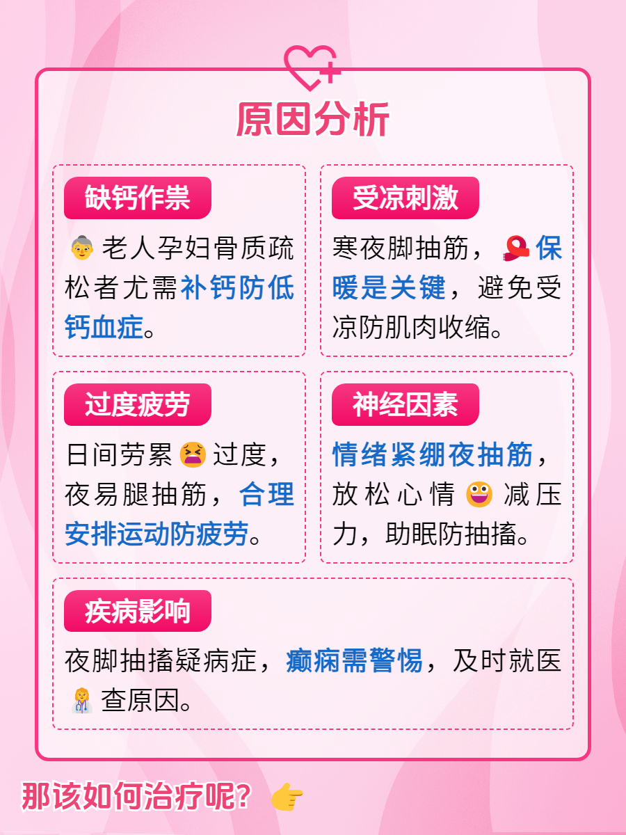 🔍缺钙作祟:缺钙是导致夜间脚抽搐的常见原因。夜间血钙水平下降,容易引发低钙血症,导致神经肌肉兴奋性增强,从而引发抽搐。尤其是老年人、孕妇和骨质疏松患者更需注意补钙。