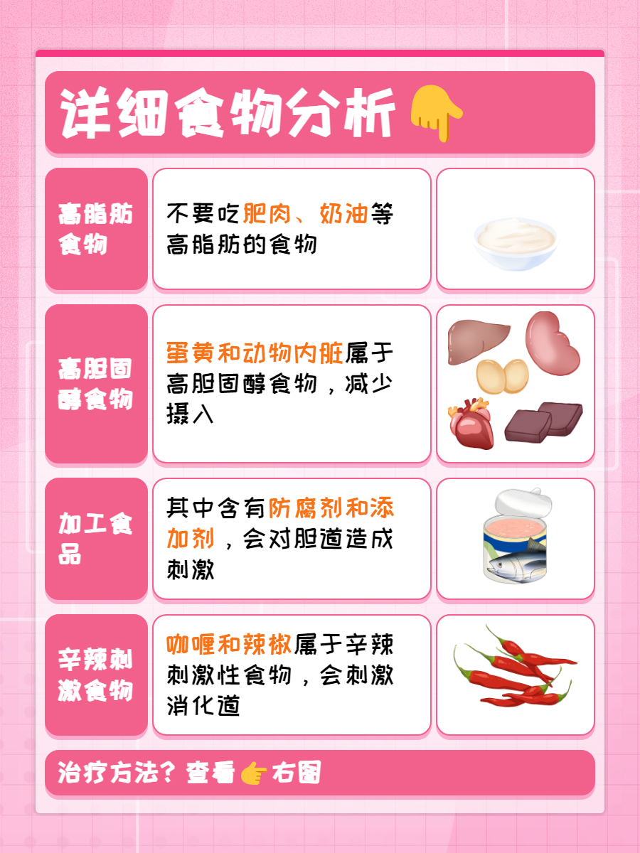 1. 高脂肪食物:油炸食品、肥肉、奶油等高脂肪食物会刺激胆囊收缩,加重症状。🍟🥓