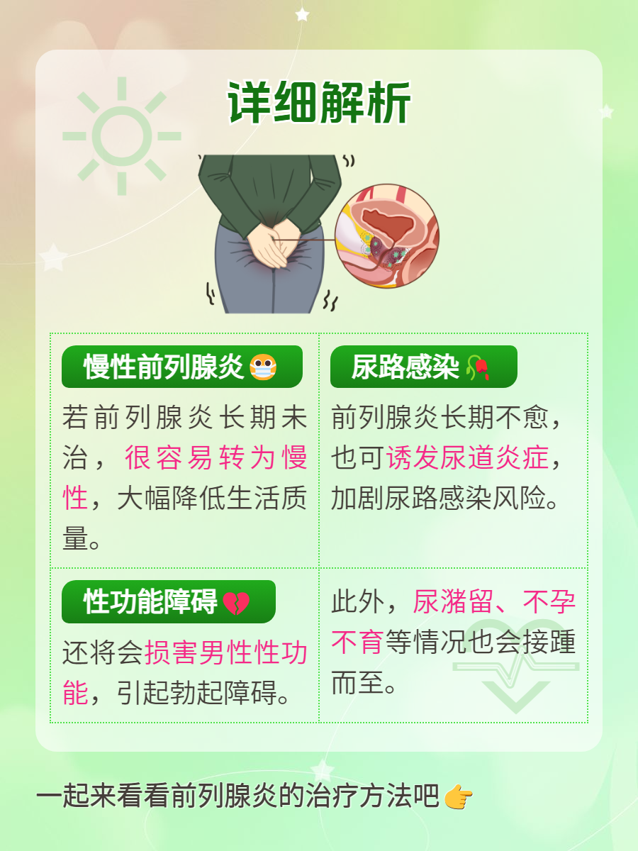 1、慢性前列腺炎 🔄:前列腺炎如果长期不治疗,可能会发展成慢性前列腺炎。慢性前列腺炎的症状持续时间更长,治疗难度更大,患者可能会反复发作,严重影响生活质量。