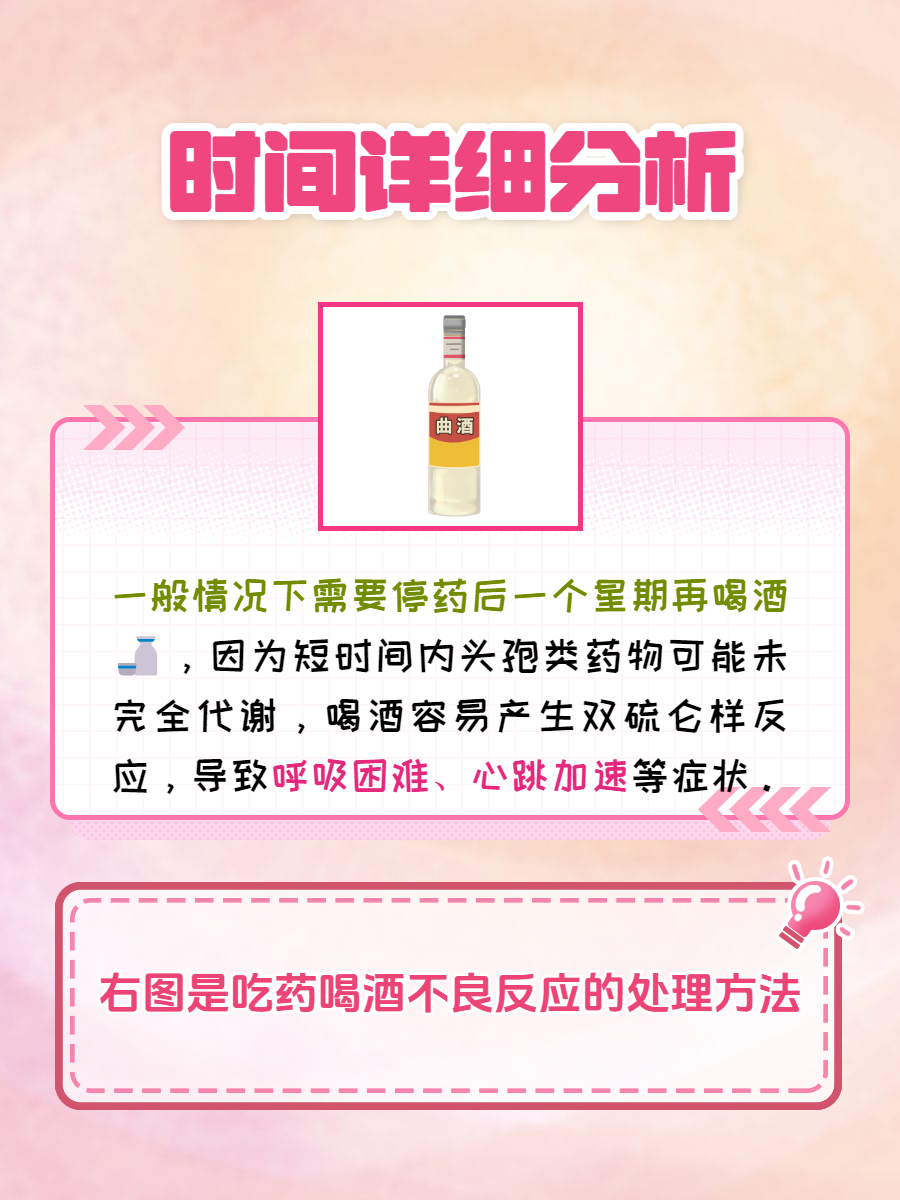 🔔我们要了解吃了头孢药物后再喝酒,容易导致酒精在体内代谢受阻,产生双硫仑样反应,这种反应可能会引起心跳加速、呼吸困难,甚至威胁到生命。一般情况下吃了头孢后至少一个星期内不能喝酒🍷,因为头孢类的药物在体内完全代谢需要一定的时间,而每个人的代谢速度是不同的,因此为了安全起见,最好在停药后一星期再饮酒。
