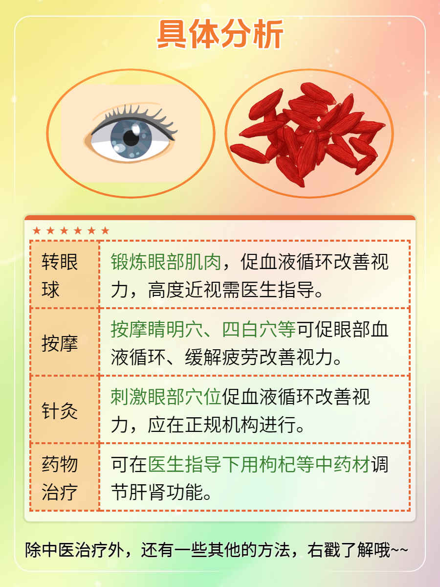 4、药物治疗。中医认为近视眼是由于肝肾不足、气血两虚等原因引起的,可以在医生的指导下使用一些中药材来调节肝肾功能,如枸杞、黄芪、菊花等。这些中药材具有滋补肝肾、明目等功效,可以在一定程度上改善视力。💊