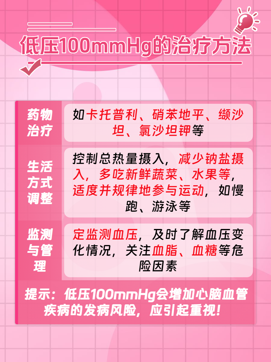 对于这种情况,患者可能会感到头晕、心悸等不适症状。🔍高血压不仅会增加心脏病、中风等心血管疾病的风险,还可能对肾脏、眼睛等器官造成损害。因此,一旦低压持续在100mmHg左右,务必及时就医,接受专业治疗。