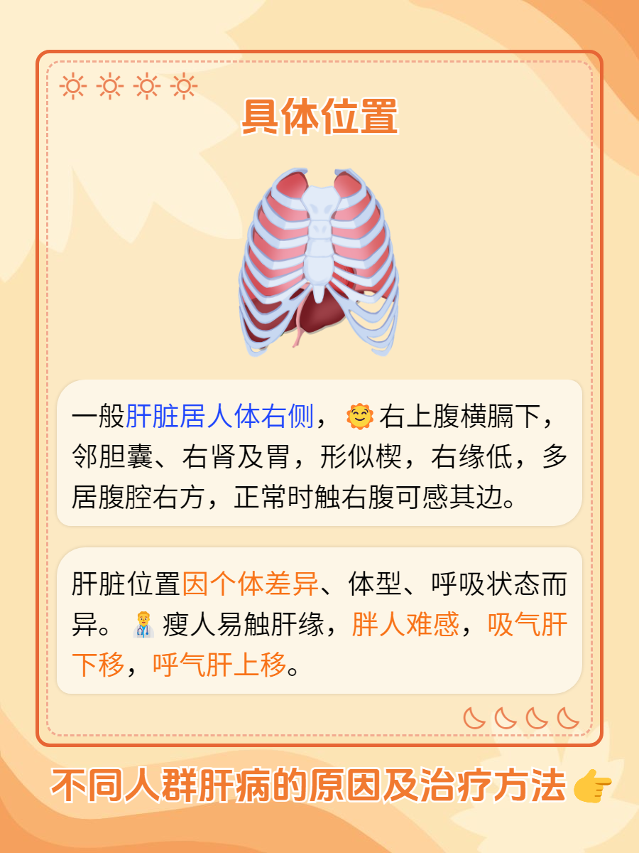 😊肝脏的位置并不是绝对的,它可能会因为个体差异、体型、呼吸状态等因素而有所变化。例如,在瘦削的人群中,肝脏的边缘可能更容易被触及;而在肥胖的人群中,由于脂肪的堆积,肝脏的边缘可能不易被感知。此外,呼吸状态也会影响肝脏的位置。吸气时,由于膈肌的下降,肝脏会随之向下移动;呼气时,肝脏则会向上移动。这些变化都是正常的生理现象,不需要过于担心。
