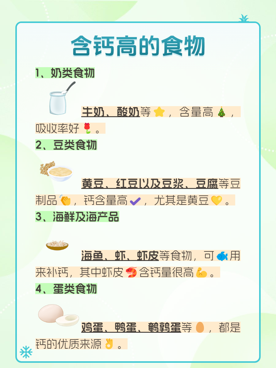 💐以上就是含钙高的食物,是钙的优质来源。不过对于缺钙严重的人来说,单靠食补无法补足,要遵循医嘱使用药物。平时也应多晒太阳,促进钙的吸收。