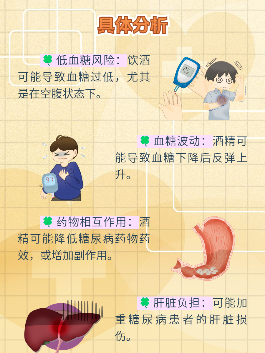 ⚠️低血糖风险:饮酒可能导致血糖过低,尤其是在空腹状态下。