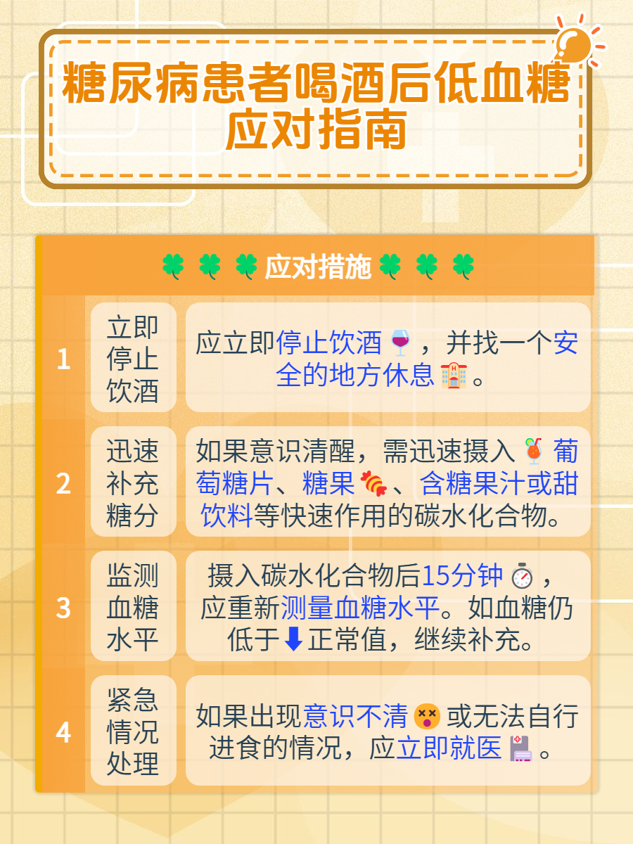 🔹血糖监测:饮酒前后及过程中,密切监测血糖水平。