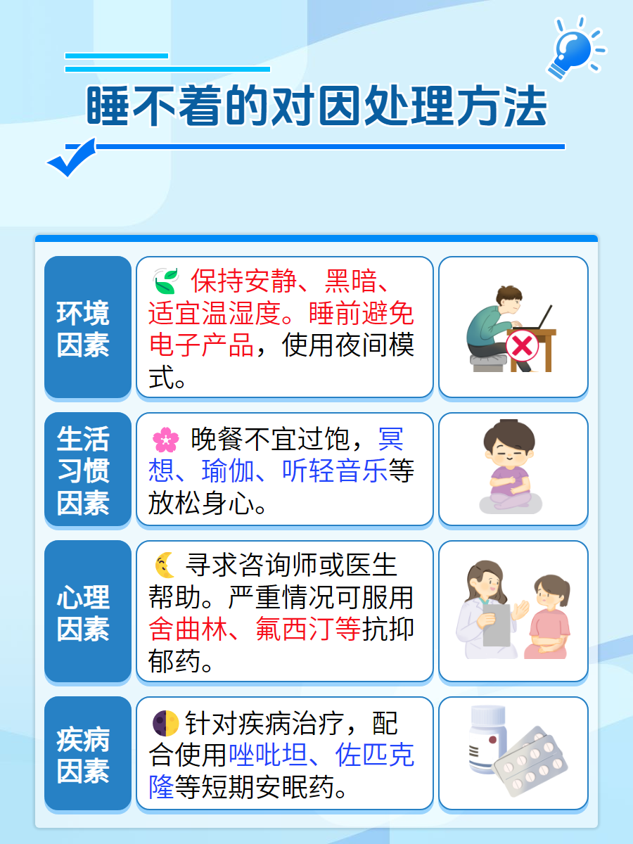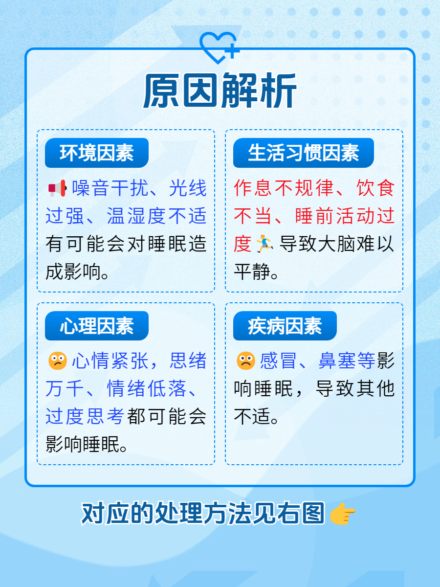 💙生活习惯因素,比如长期熬夜、周末补觉等不规律的生活习惯会打乱生物钟,导致入睡困难。晚餐过饱、摄入过多咖啡因或辛辣食物等都会影响睡眠质量。剧烈运动、看恐怖电影或玩刺激性游戏都会使大脑兴奋,难以平静入睡。