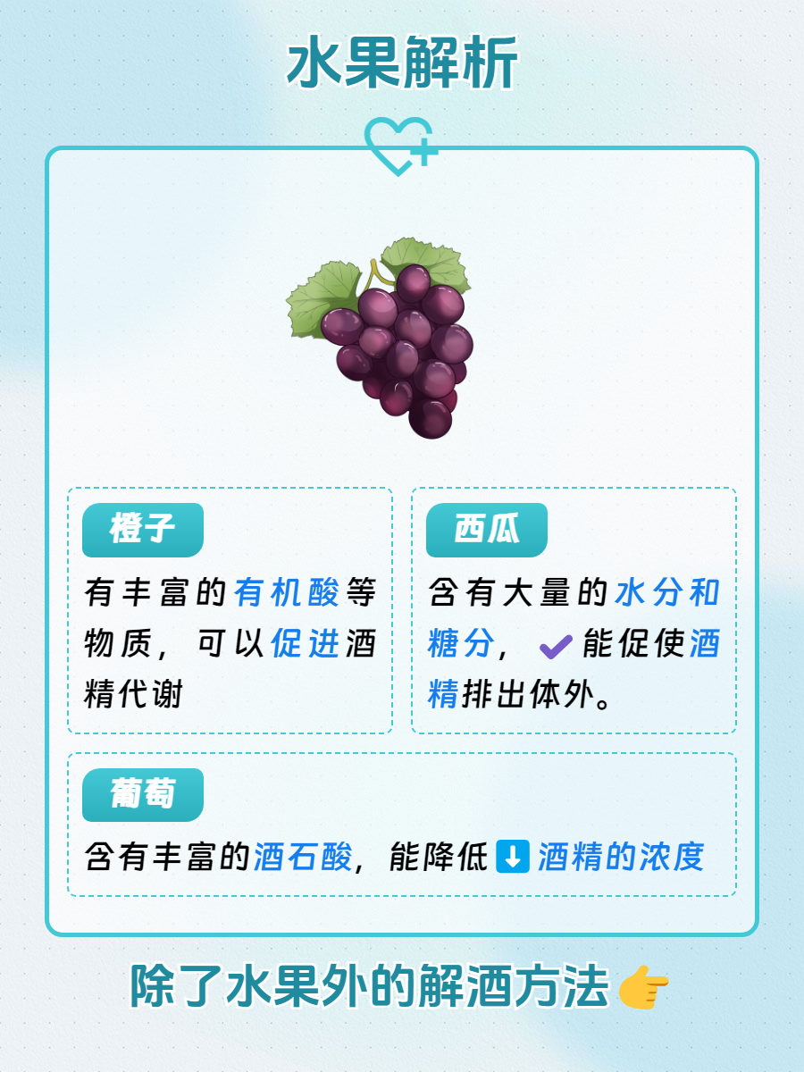 ⭕️3、葡萄:葡萄中含有丰富的酒石酸,可以和酒精中的乙醇产生相互作用,从而形成酯类物质,可以有效降低⬇️酒精的浓度,达到解酒的目的。