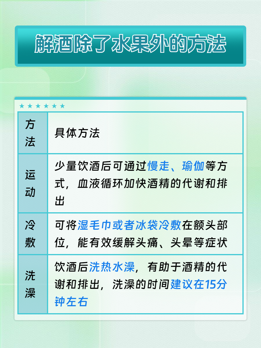饮酒后除了吃水果进行解酒外,也可通过运动💪、冷敷、洗澡等方法进行改善。可根据自身的喜好以及身体状况✨选择合适的解酒方法。