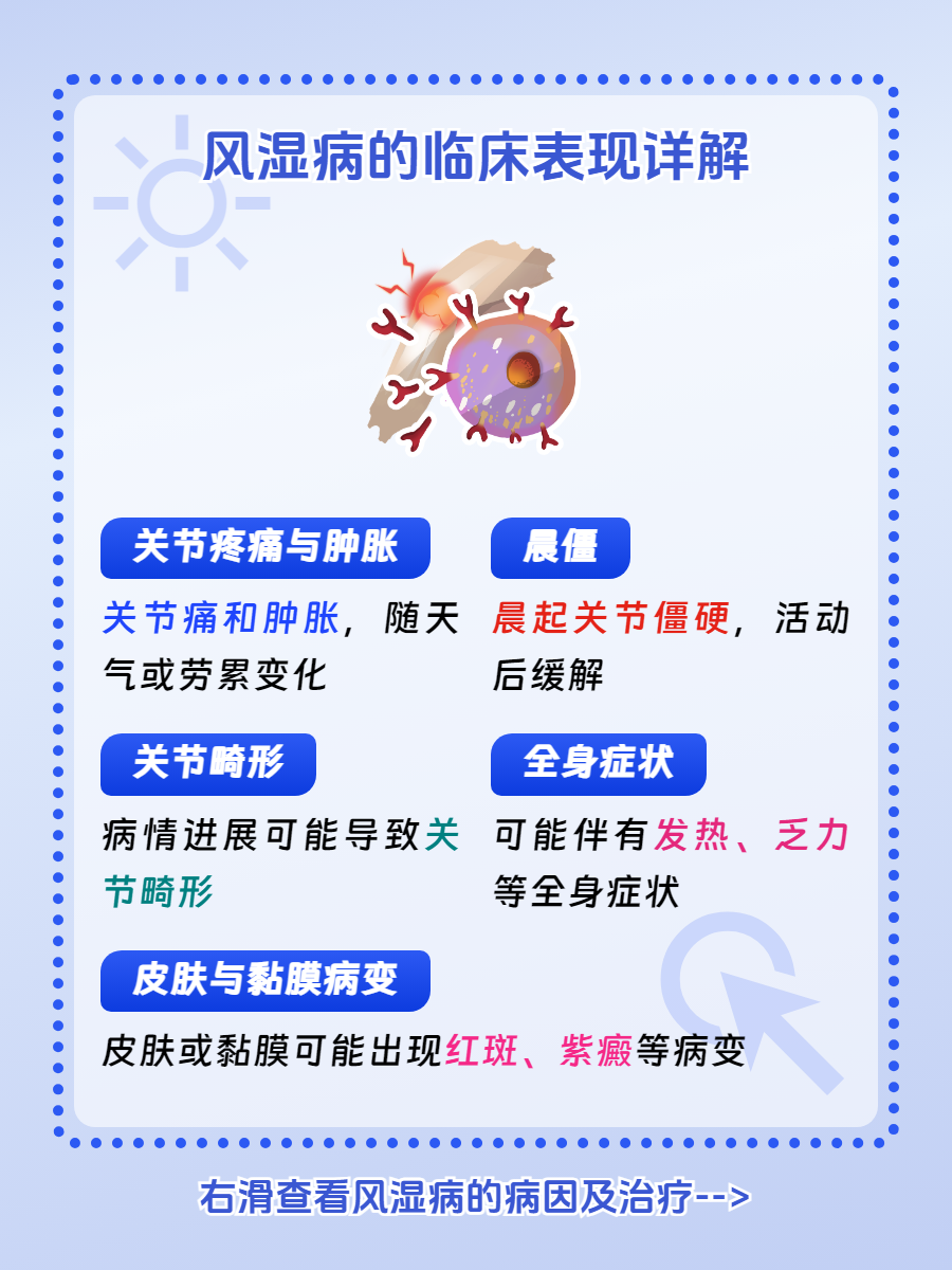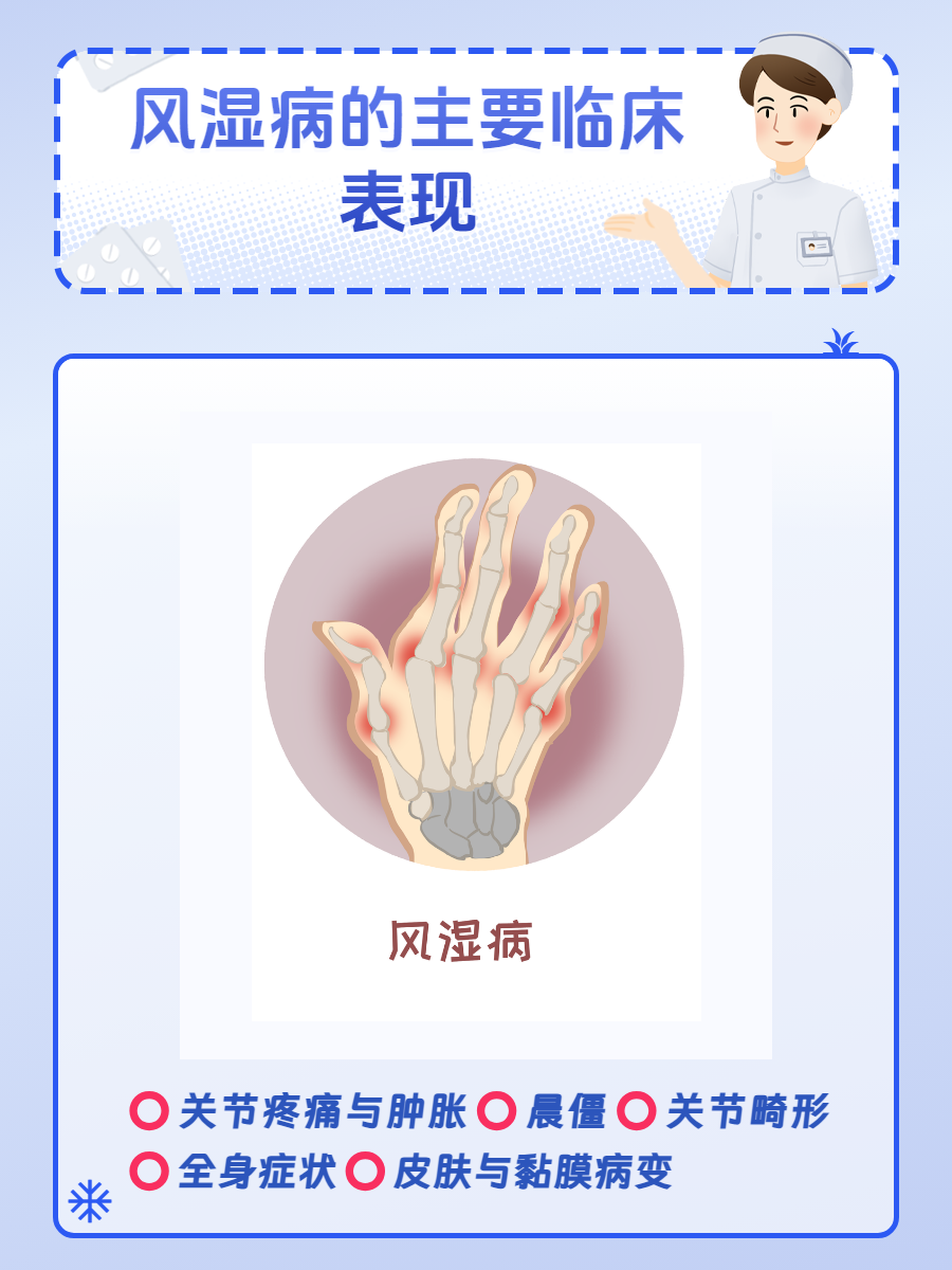 针对风湿病的这些临床表现,建议患者一旦出现相关症状,应及时就医,以便进行早期诊断和规范治疗。