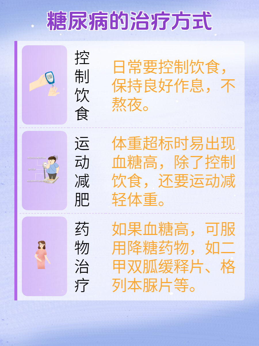 👀1、疾病程度:当血糖仅出现轻度上升时,其治疗并不复杂,通常只需通过改善饮食习惯、进行适量运动以及减轻体重等生活方式上的调整,就能有效地管理血糖水平。但如果血糖较高,需要在医生指导下服用降糖药物,如格列本脲片、二甲双胍缓释片等,这些药物可通过提高胰岛素敏感性,降低血糖。