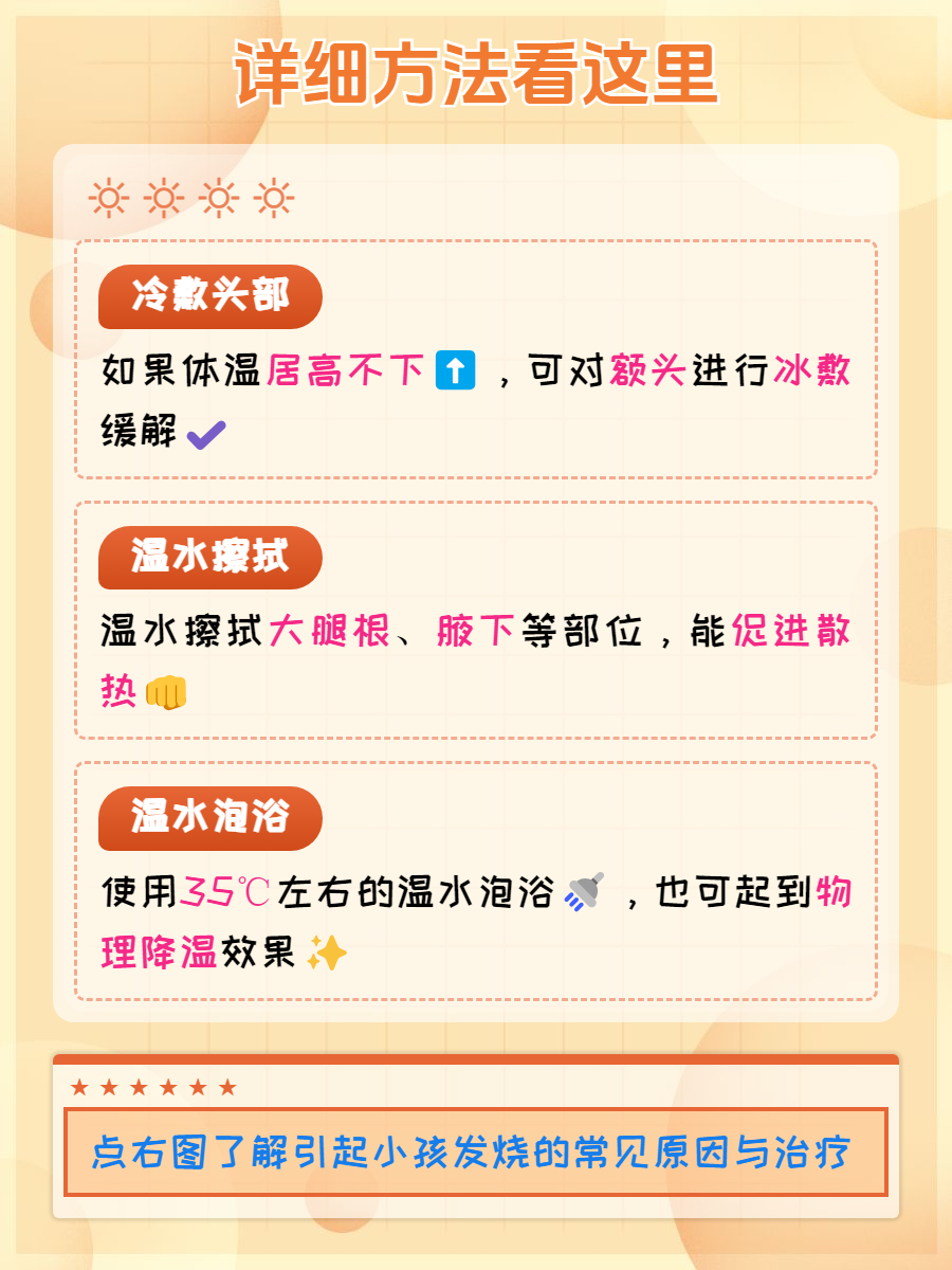 🌟温水泡浴:如果观察到小孩的精神状态还算良好,也可以选择温水泡浴🚿进行物理降温,尽量保持水温在35~37℃之间,泡浴时间掌控在10分钟左右,能够促进全是毛细血管扩张,加快散热。