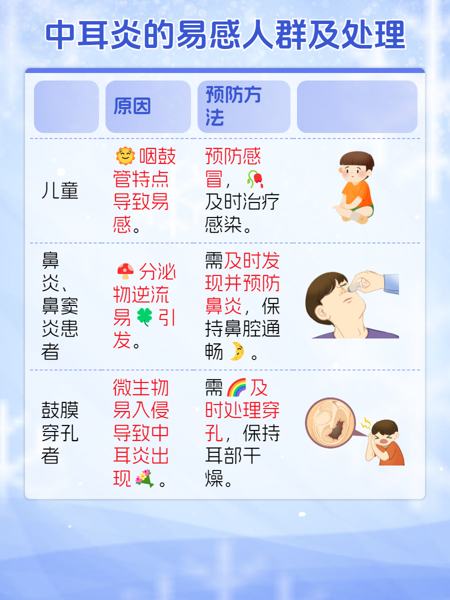 了解中耳炎的易感人群及其处理策略,有助于我们更好地预防和治疗这一疾病。让我们共同关注耳部健康,守护听力安全!别忘了分享这篇文章给更多需要的朋友哦!👍✨你的每一次转发都是对健康的支持!💖🌟