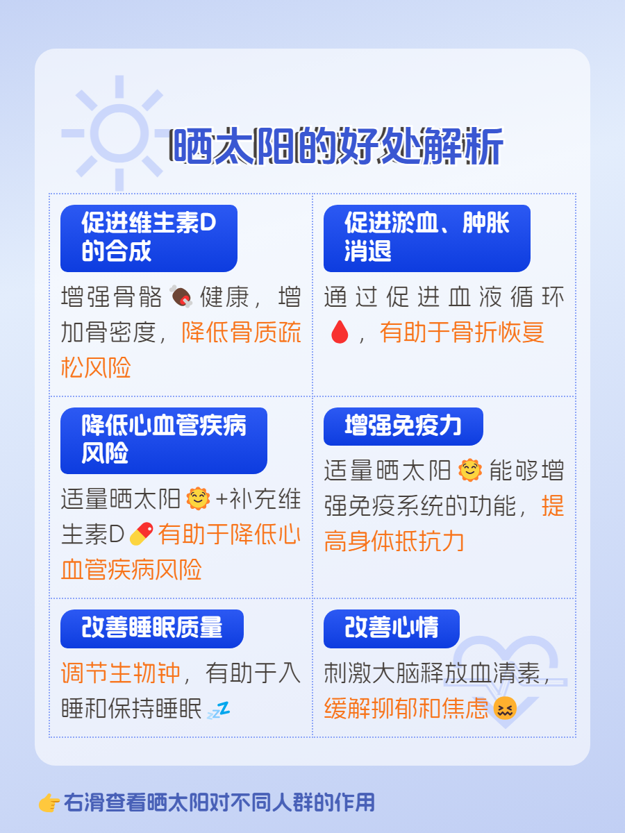 🔴增强免疫力:适量的阳光照射能够增强免疫系统的功能,提高身体对疾病的抵抗力。