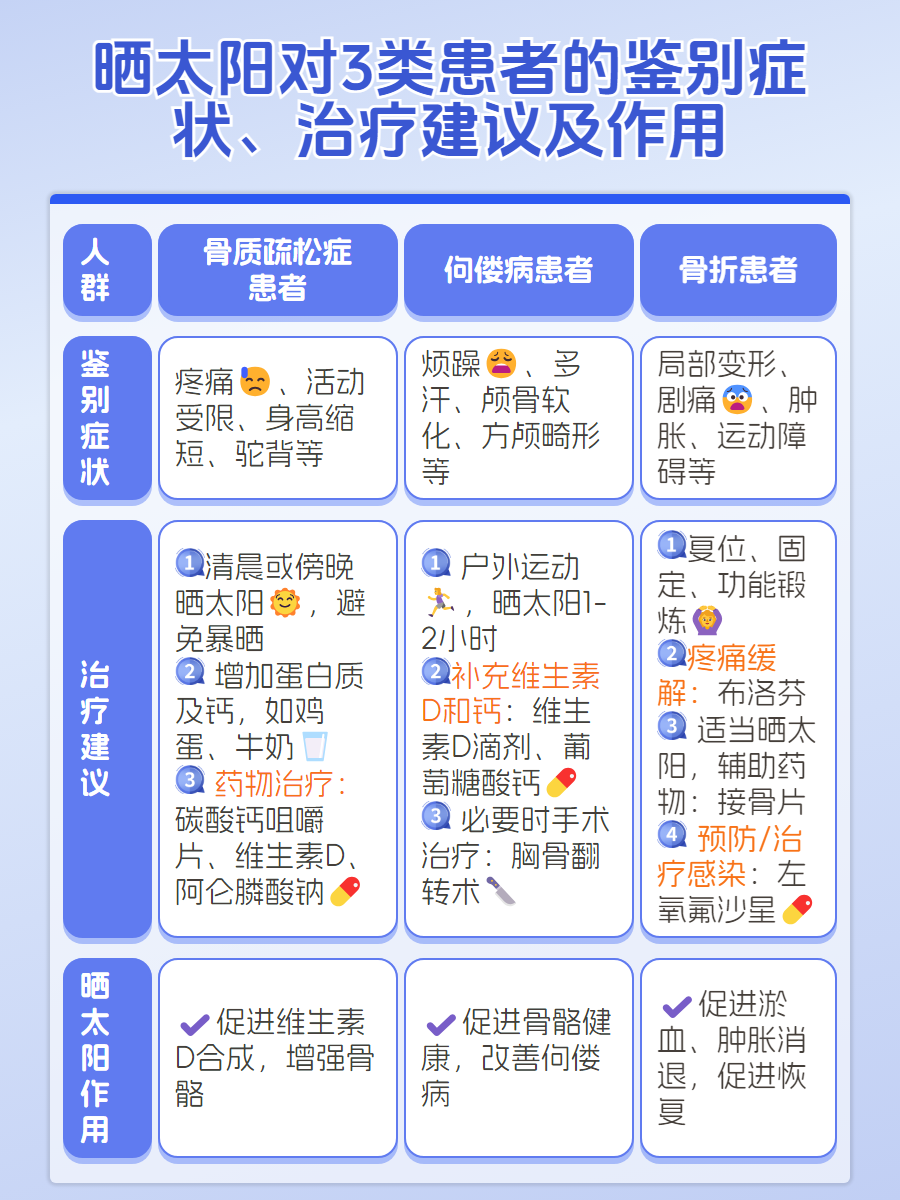 🔴促进淤血、肿胀消退:晒太阳时相对比较温暖,可以促进身体的血液循环,从而促进骨折端淤血、肿胀的消退。