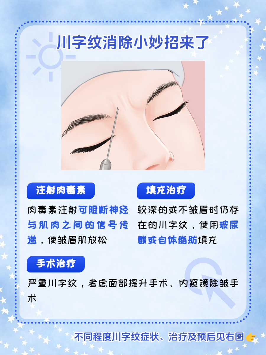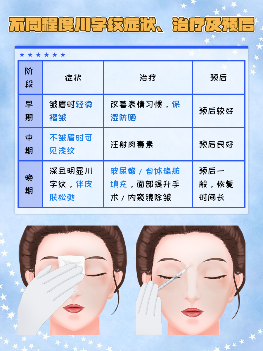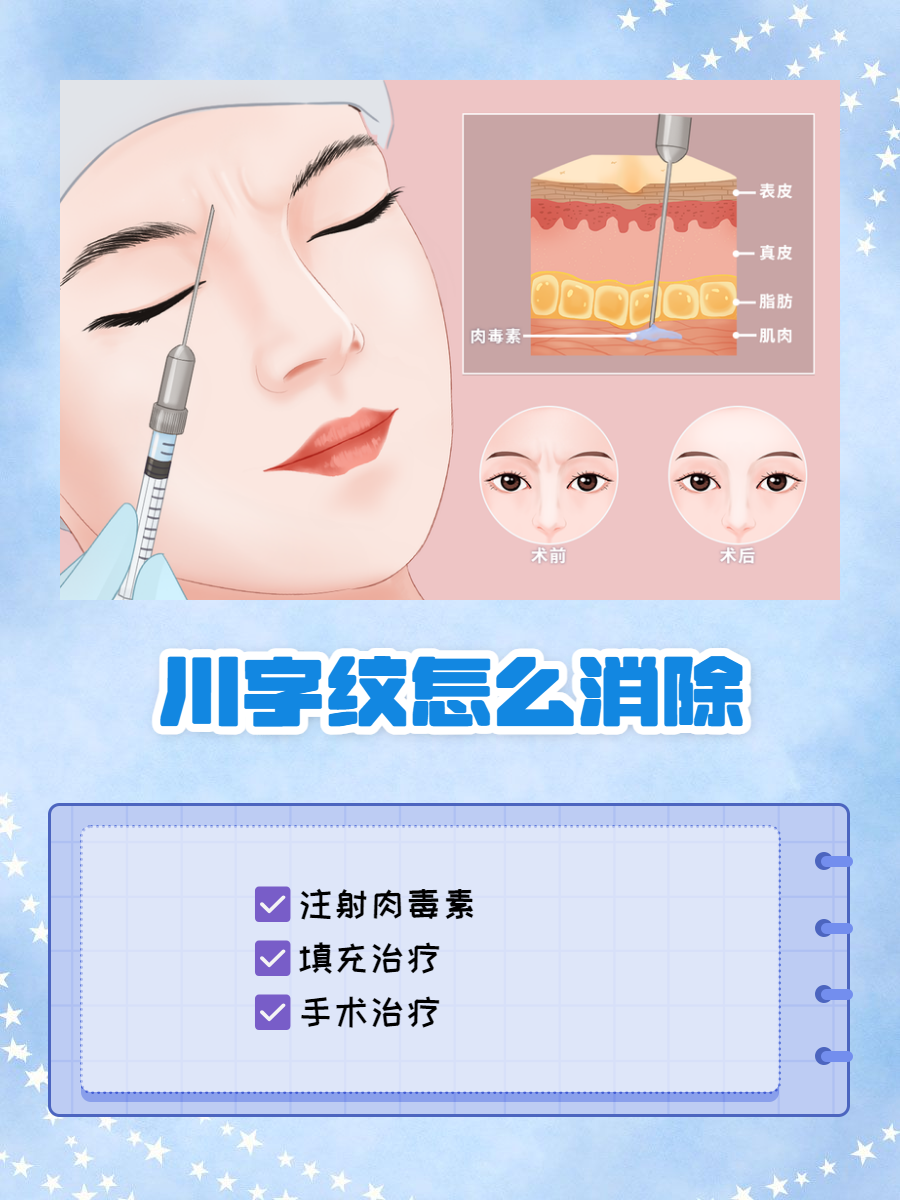 如果川字纹较深或在不皱眉时依然存在,可以考虑使用玻尿酸或自体脂肪进行填充。这些物质能够填充皮肤褶皱,使川字纹变得不明显。特别是玻尿酸,因其是人体真皮组织之一,安全性高,且效果自然。