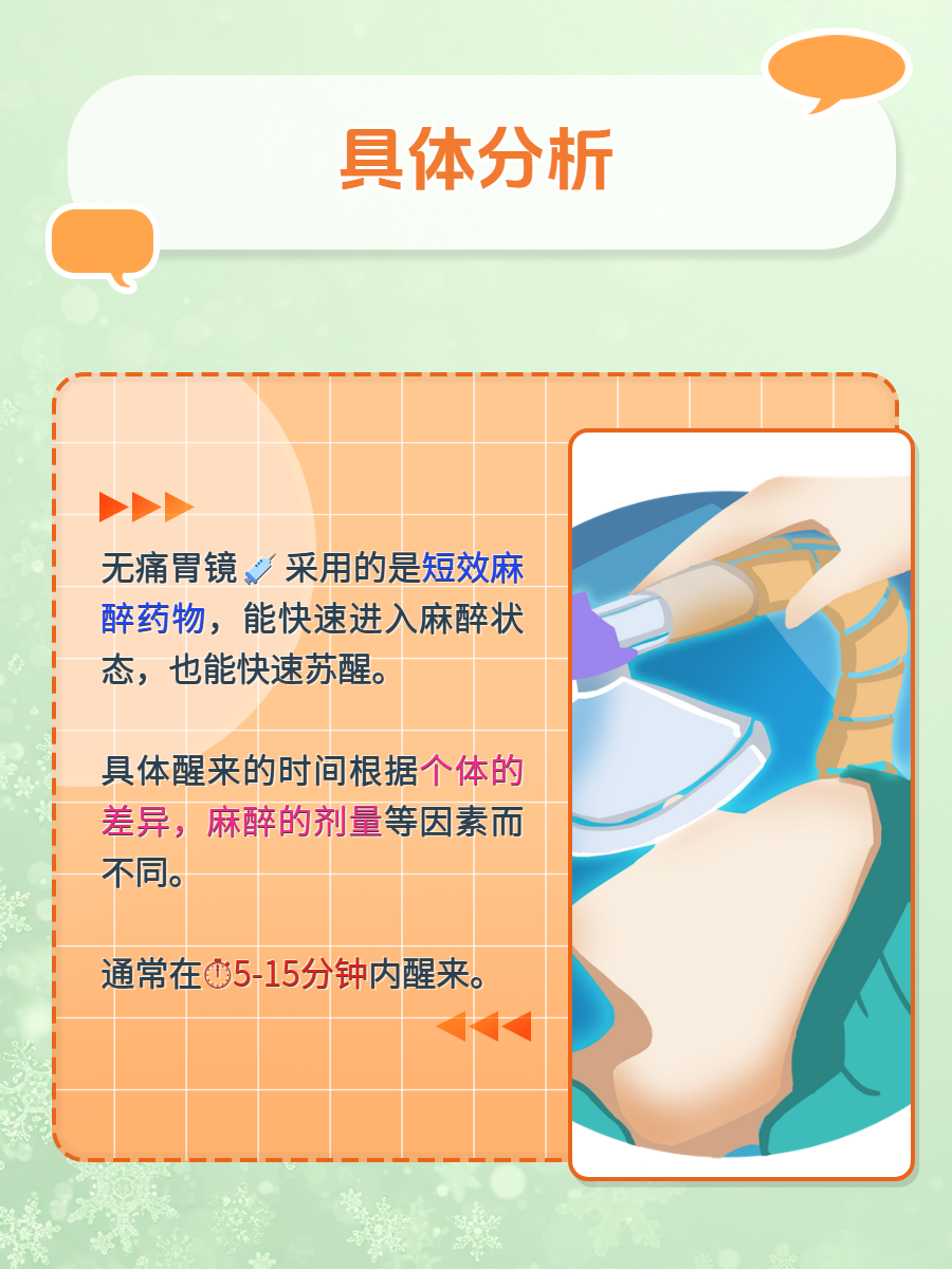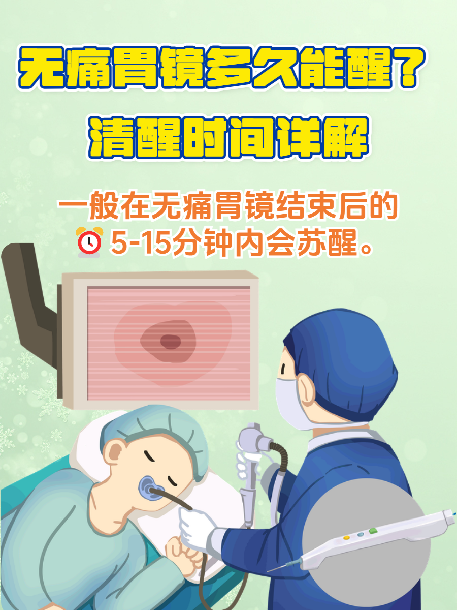 🔊一般情况下,无痛胃镜检查结束后,患者通常在 5 - 15 分钟内苏醒。这是因为无痛胃镜采用的是短效麻醉药物,像丙泊酚,这种药物能让患者快速进入麻醉状态,检查完成后药物代谢也比较快,所以患者能较快醒来。不过,苏醒时间会因个体差异(如年龄、身体代谢情况)、麻醉剂量以及是否存在其他疾病等因素而有所不同,有时候会苏醒得比较快,有时候却会延长苏醒得时间。