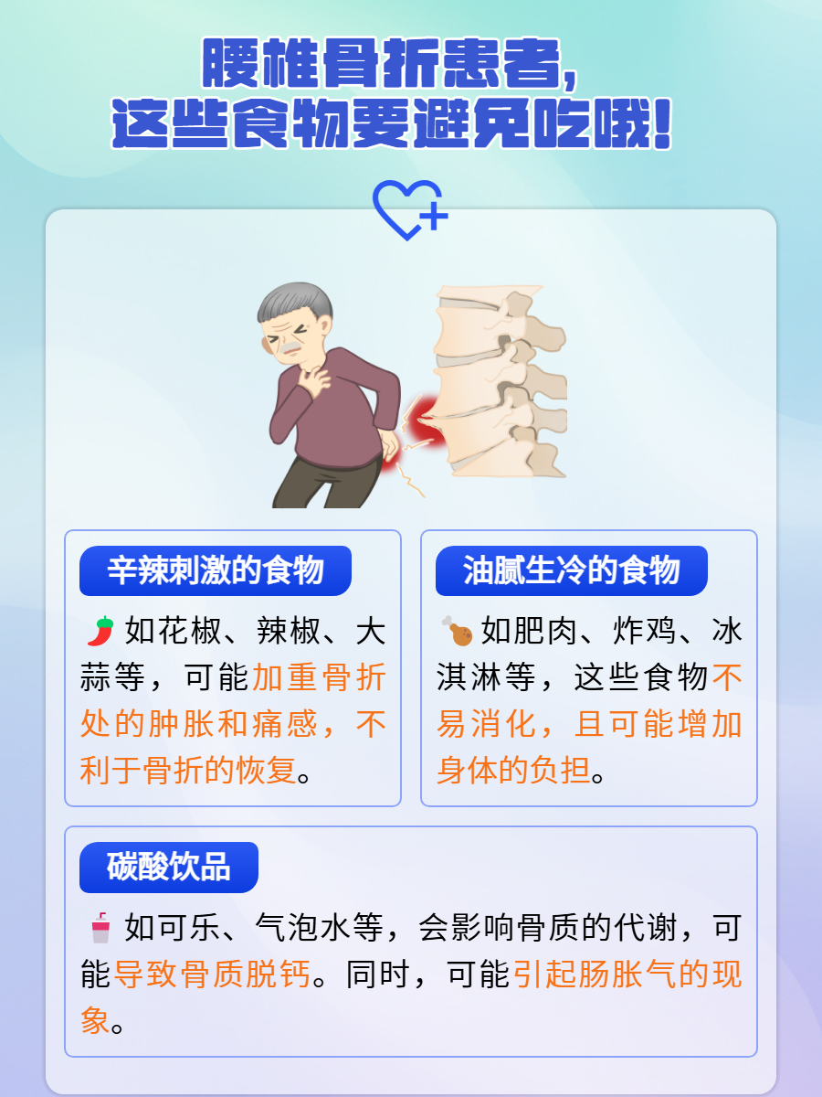 腰椎骨折后,患者应遵循医生的饮食建议,避免摄入上述忌口食物。同时,应注重营养的均衡摄入,此外,保持良好的生活习惯和乐观的心态,也有助于身体的康复。