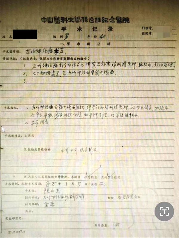 时光回溯到1988 年年初,钟女士的父亲因左听神经瘤术后并发脑积水等紧急情况,紧急转到广州中山大学孙逸仙纪念医院接受手术治疗。医院神经外科陈由芝教授等医护人员全力救治,手术最终取得成功。三十多年来,钟女士的父亲身体状况稳定,一家人的生活平静而幸福。直到最近一段时间,年事已高的钟先生出现了一些健康问题,钟女士因父亲身体检查需要,想整理父亲过往的就医资料,便抱着试一试的心态来到中山大学孙逸仙纪念医院病案室查询当年的病历。令她意外的是,工作人员迅速调阅找到了那份虽已纸张泛黄却完好无损的病历。