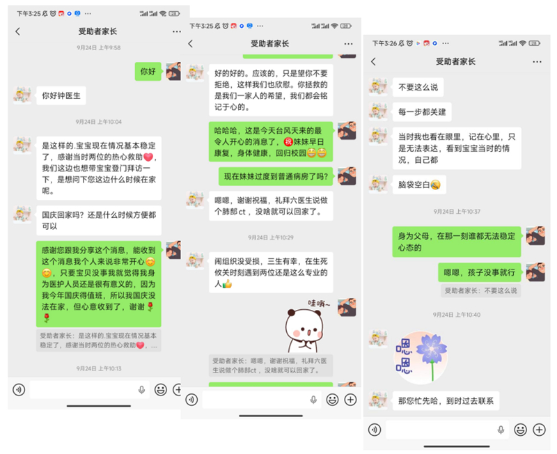 直到10月8日,国庆假期最后一天,正在CCU工作的钟伟奇接到一个陌生电话。“请问是钟伟奇护士吗?我是您在梅州救了我女儿的家人。”电话那头,家长的声音哽咽着,断断续续讲述了孩子的情况:经过ICU抢救和后续治疗,女童已脱离危险,即将康复出院。原来,家长为了寻找恩人,先是通过小区物业调取监控,模糊看到钟伟奇带女儿离开时的身影,又辗转联系到钟伟奇父母所在的社区,才终于拿到了他的联系方式。