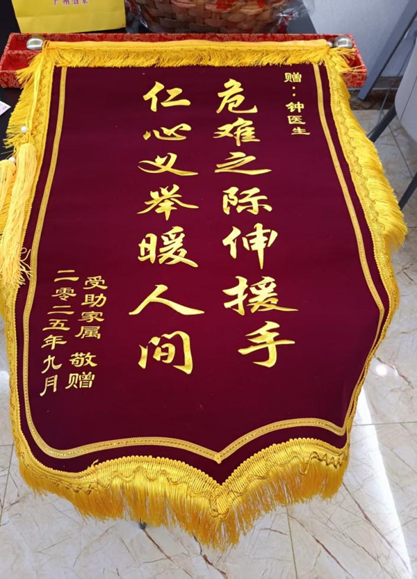 10月9日,一面印着“危难之际伸援手,仁心义举暖人间”的锦旗送到了钟伟奇在梅州的父母家中。红色的锦缎上,金色的字迹熠熠生辉,不仅是对钟伟奇个人的褒奖,更映照出无数医护人员“敬佑生命、救死扶伤”的职业信仰。