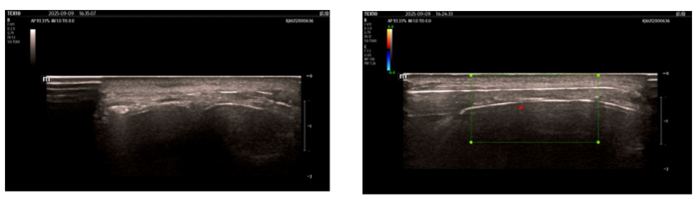 伍少玲教授、许珍医师为李先生实施了手术。在超声影像的实时引导下,电极被精准放置于左侧眶上孔周围——这里是三叉神经 V1 支(眼神经)的关键走行区域,也是刺激大脑意识中枢的重要靶点。术中超声清晰显示,电极正位于左侧眶上孔正上方的神经走行区;同时,通过体外程控调节电流,当场诱发了李先生眶周肌肉(眼轮匝肌、提上睑肌)的收缩,这意味着刺激信号已成功传递到神经。术后复查头颅正侧位片进一步确认:电极位置准确,无偏移。