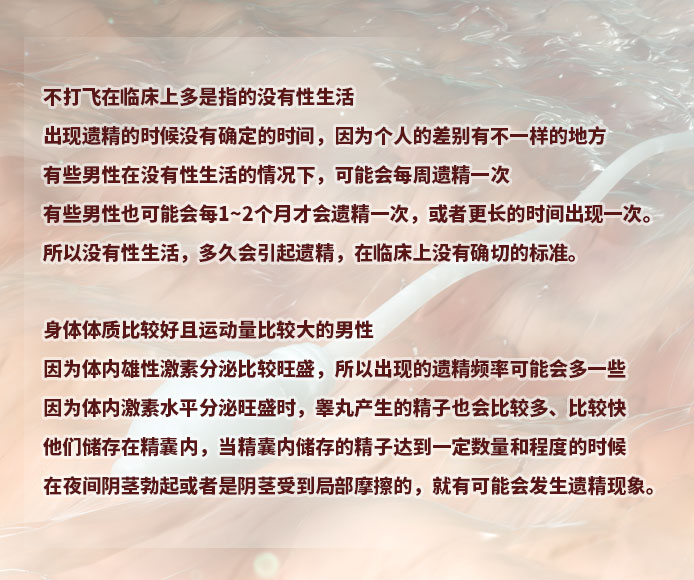 不打飞在临床上多是指的没有性生活,出现遗精的时候没有确定的时间,而且会因为个人的差别有不一样的地方,有些男性在没有性生活的情况下,可能会每周遗精一次,有些男性也可能会每1~2个月才会遗精一次,或者是更长的时间出现一次遗精。所以,没有性生活,多久会引起遗精,在临床上没有确切的标准。